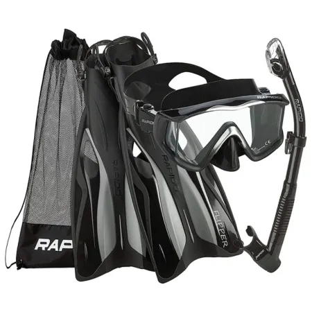 Check out this top tier set from Phantom Aquatics that comes in 10 colors. It features everything you want, a panoramic mask, dry snorkel, vented fins and a compact design for travel.